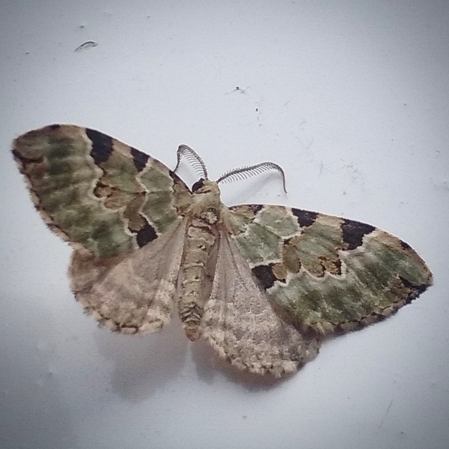 It was a green carpet moth; my initial hunt through our ‘complete insects’ seemed not to find it – yet I realised this was because its wings were held out as if in mid flight. The picture in the book showed it as a triangular shape, with its wings held back – obviously its normal resting position. But the colouring and pattern made it easy to identify, once I’d worked this out. I took this photo and then gently let it fall out of the window – ‘fall’ is the wrong word; it floated, so light that it rode the breeze like a tiny feather.