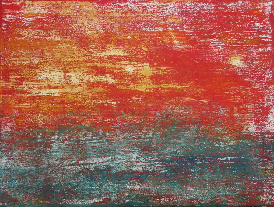 Blaze of Glory is an abstract acrylic on canvas. My first piece to be featured in an exhibition , this is a colourful, striking piece conjuring ideas of sun and sea… with the fiery red sky that is a feature of various pieces of my work.